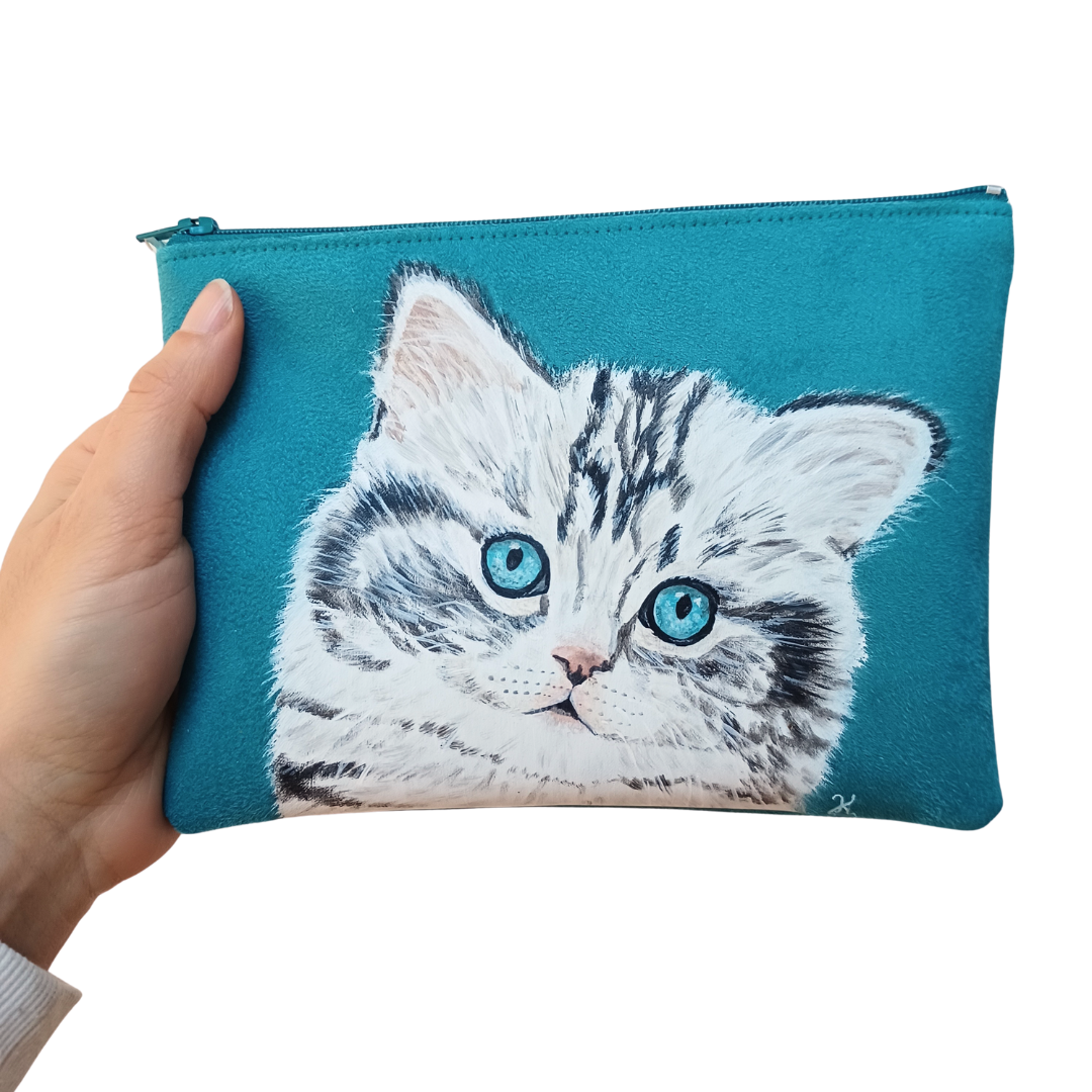 Pochette peinte à la main en suédine turquoise, Lili le chaton