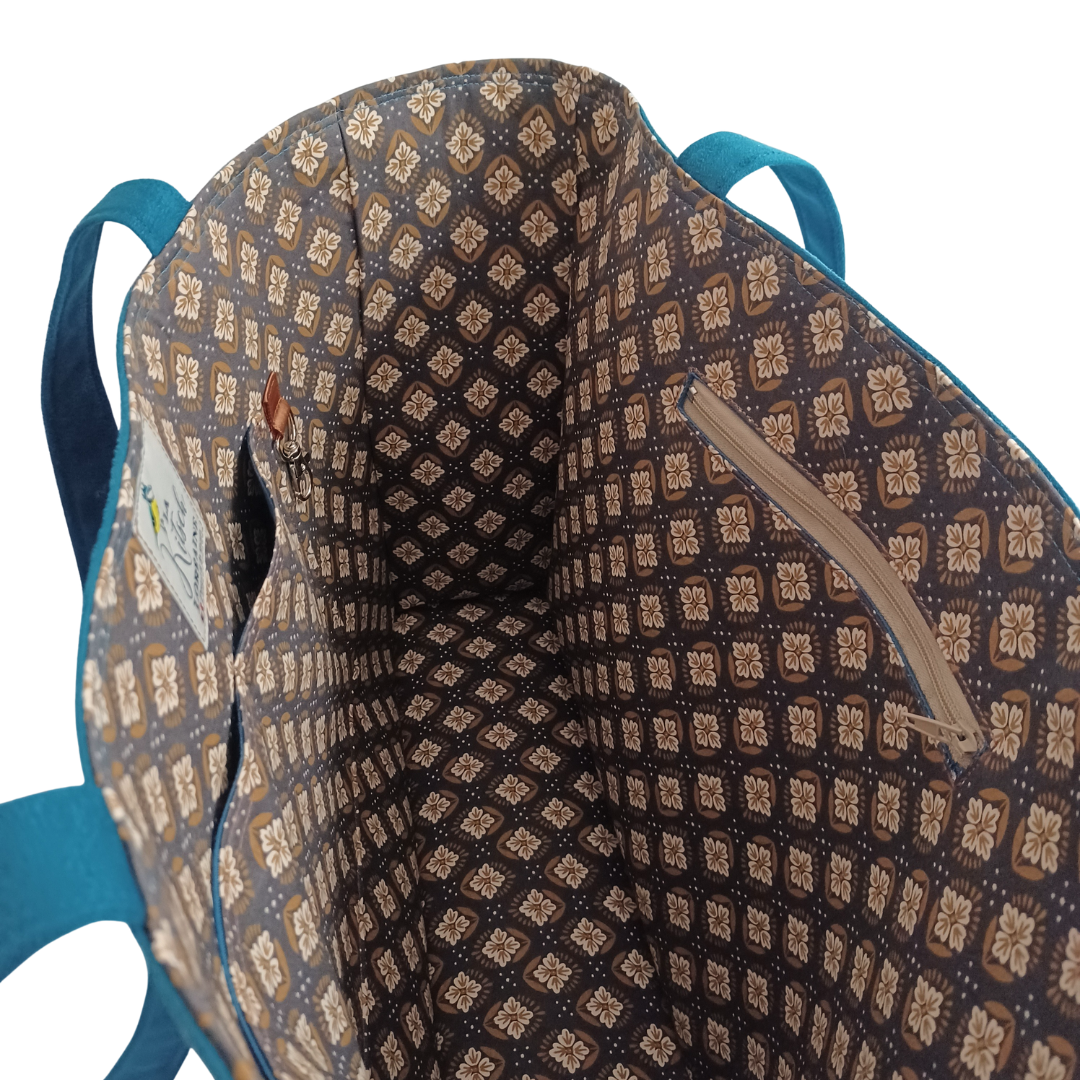 Extérieur : suédine (imitation du daim en polyester) de la couleur bleu paon. Ce tissu offre un toucher très doux et agréable, et a l’avantage d’être lavable à la main.